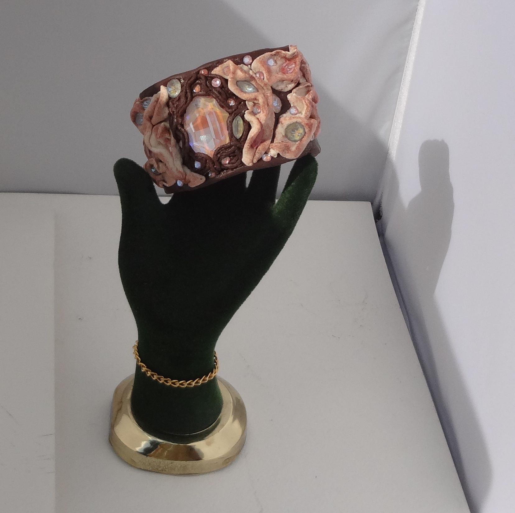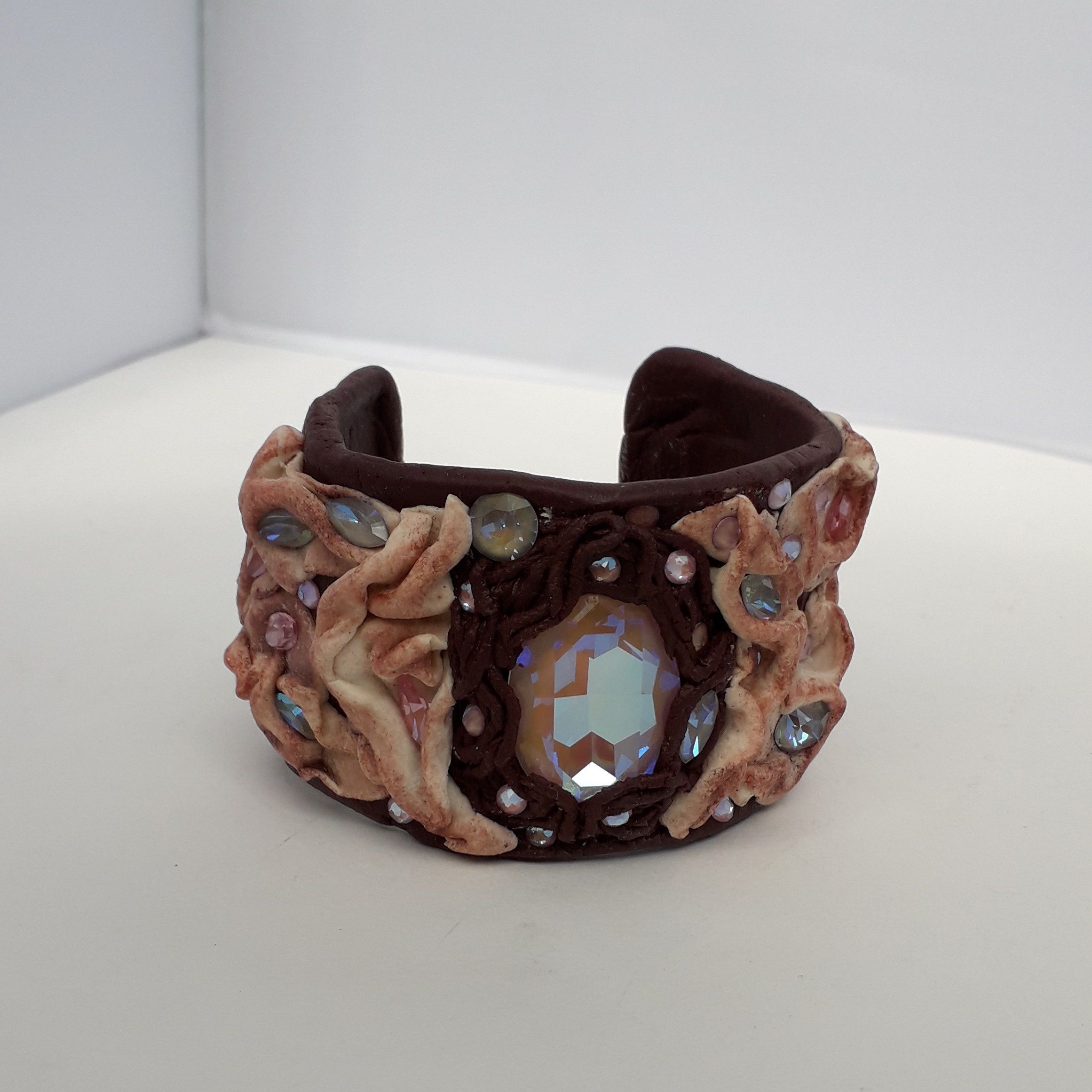 Что для нас означает кристалл? Идеал, совершенство, абсолют... Мы говорим: "Кристально чистый", "кристально ясный" и даже" кристально честный". А любовь! Определений много, но интересно представить, что любовь, как и диалектику, можно рассматривать как единство и борьбу противоположностей (например, люблю мороженое и ненавижу целлюлит). А в моем браслете объединились теплая цветовая гамма с холодными искрами, идеальная четкость граней кристаллов с мягкими складками, непревзойденный блеск и прозрачность с эффектом пудры...Вот такая диалектика получилась...