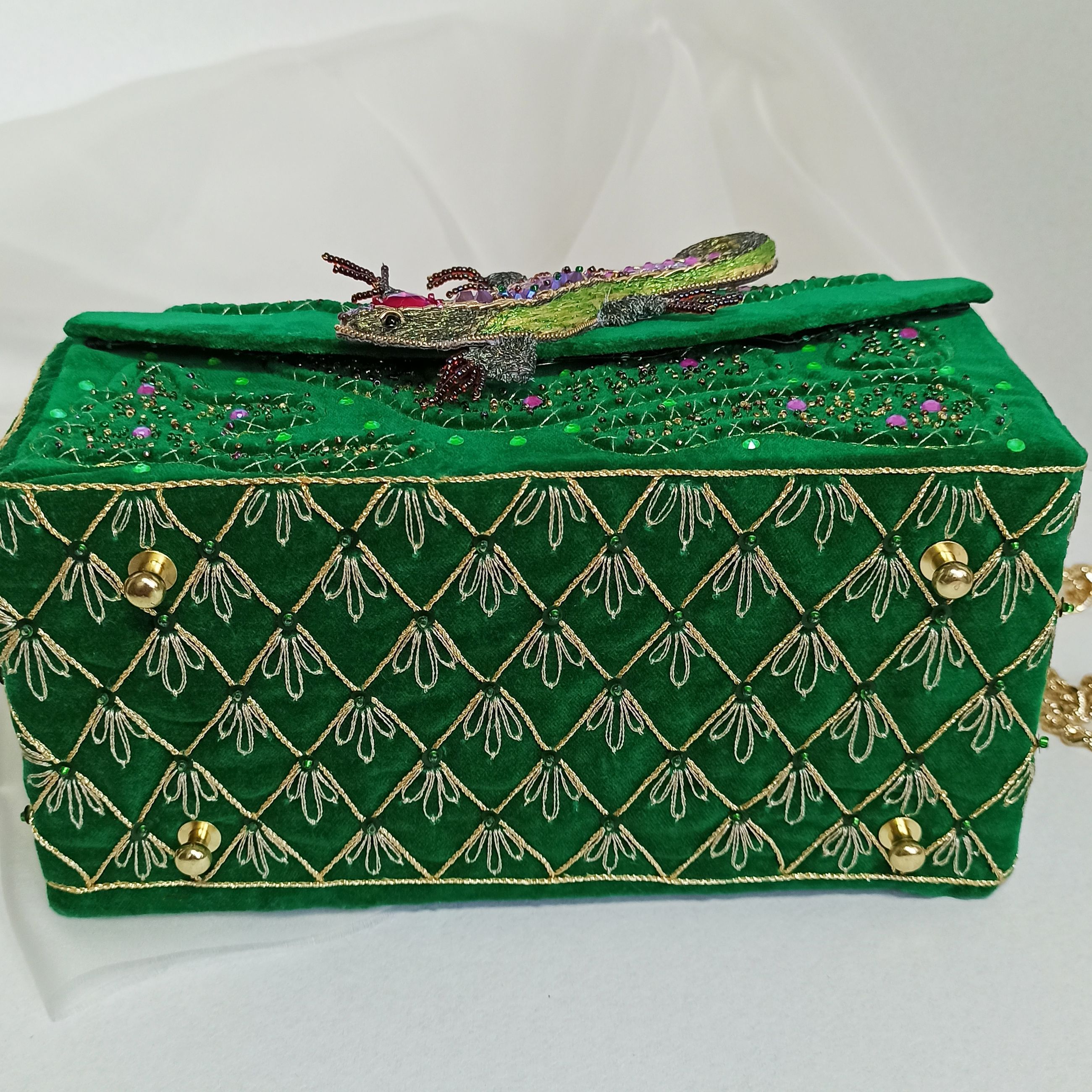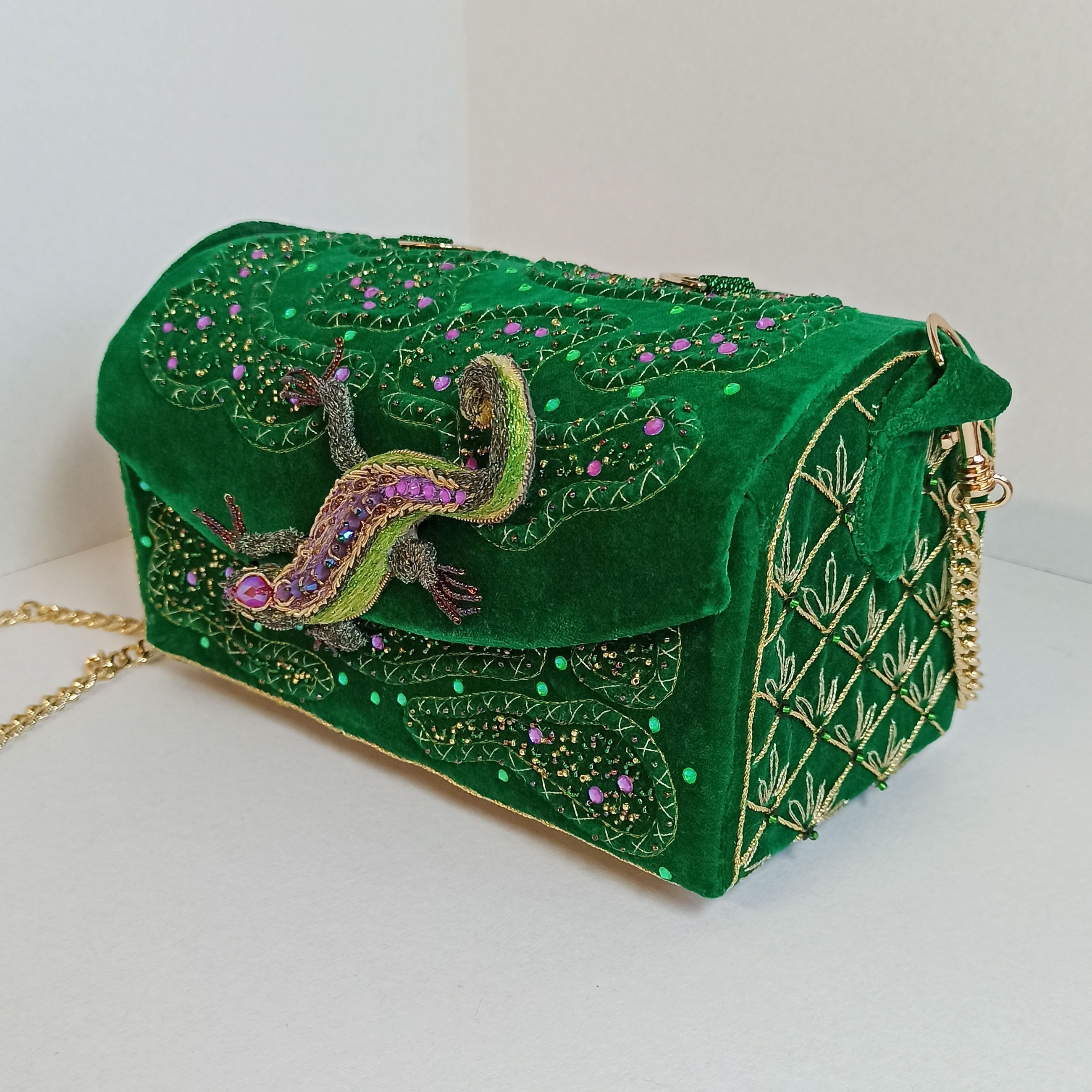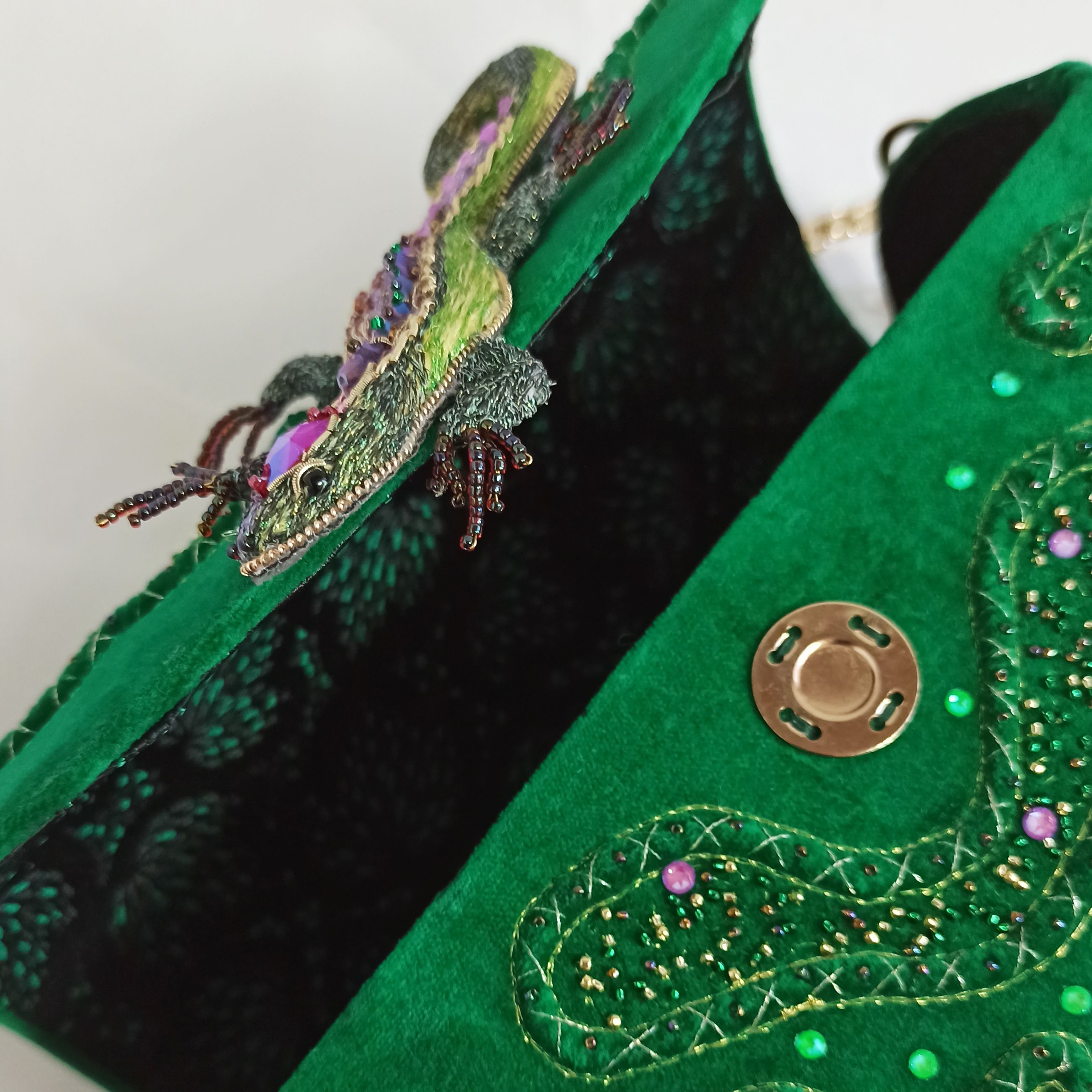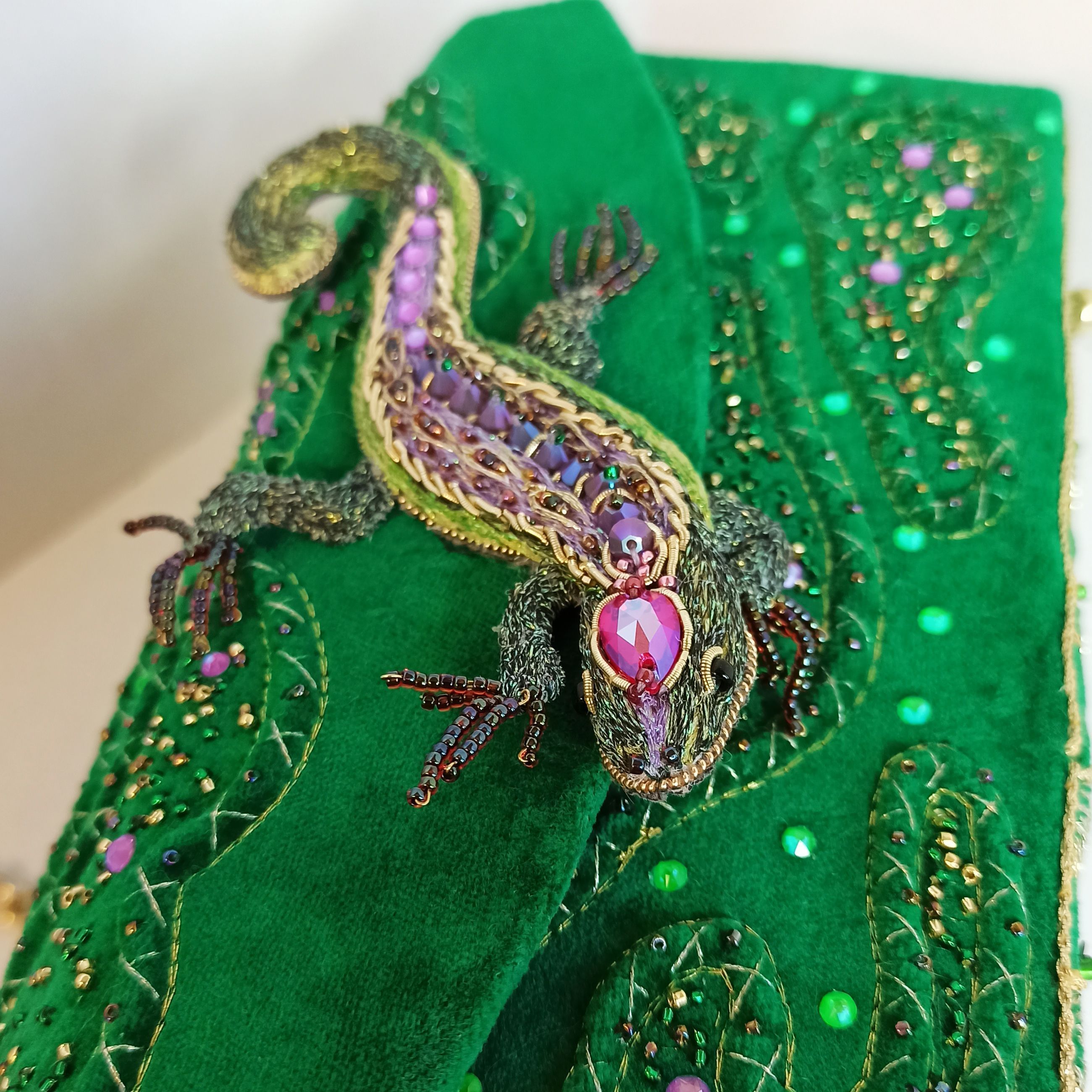 Моя конкурсная работа — сумочка-сундучок, в которой хранятся сокровища хозяйки Медной горы. Работа так и называется — "Хозяйка Медной горы". Поэтому я решила украсить сумку яркими стразами, блестящим бисером — кажется, всё это передаёт ощущение сказки. И, конечно, главное украшение — ящерка — дух-хранитель ценных минералов, а также одно из обличий Хозяйки Медной горы.