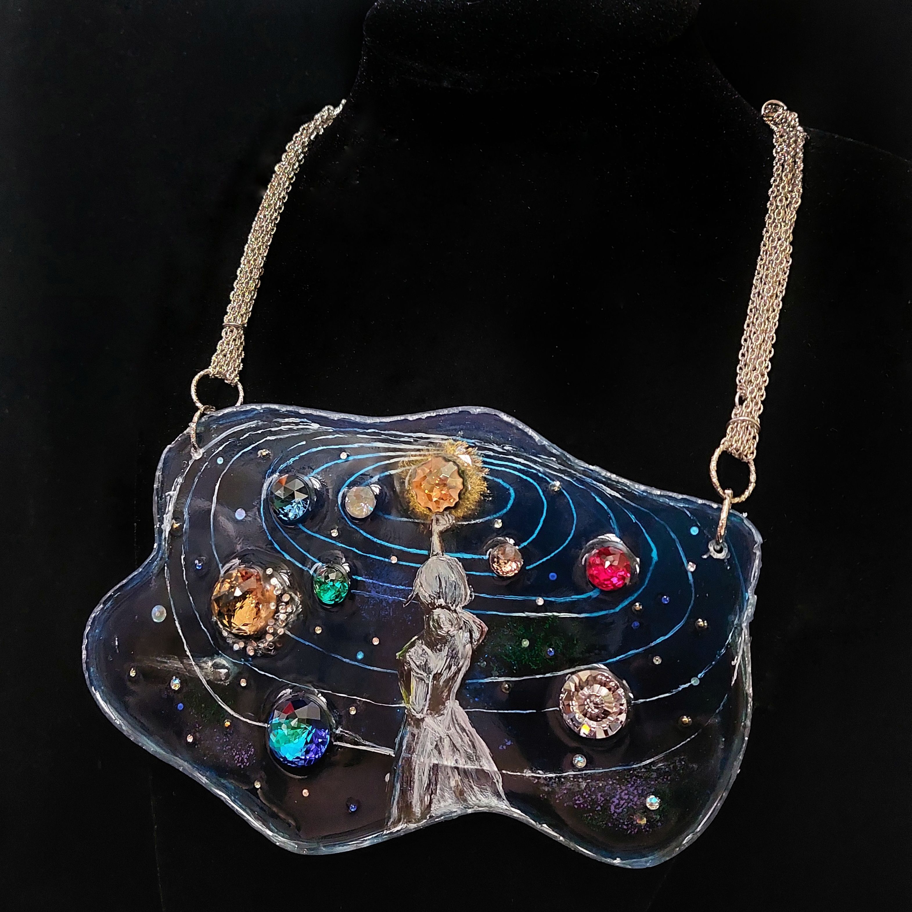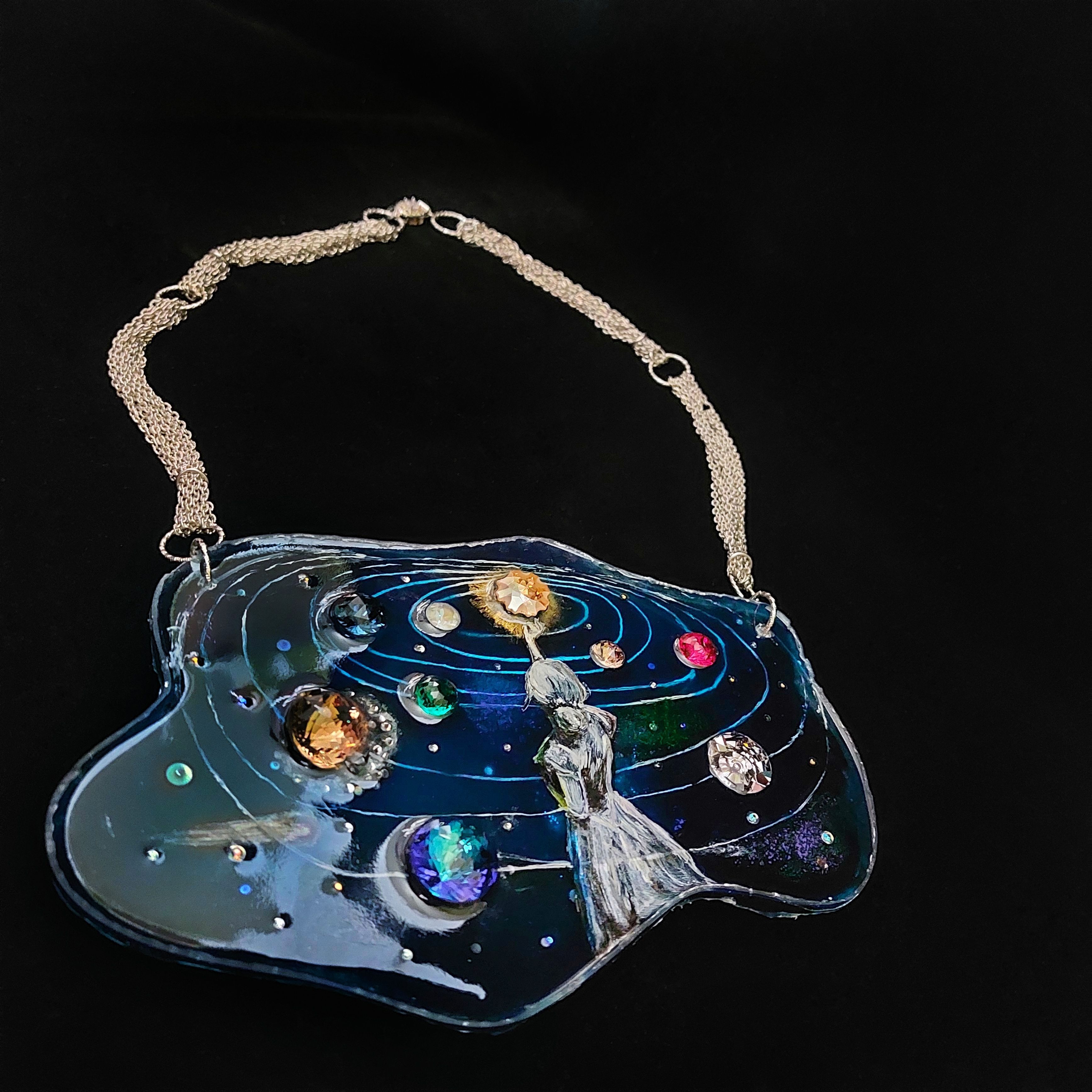 Основная часть колье выполнена методом послойной росписи по эпоксидной смоле. Этот метод дает возможность сделать элементы росписи более объемными. С помощью этого метода я хотела показать глубину космоса, его некую бесконечность.
