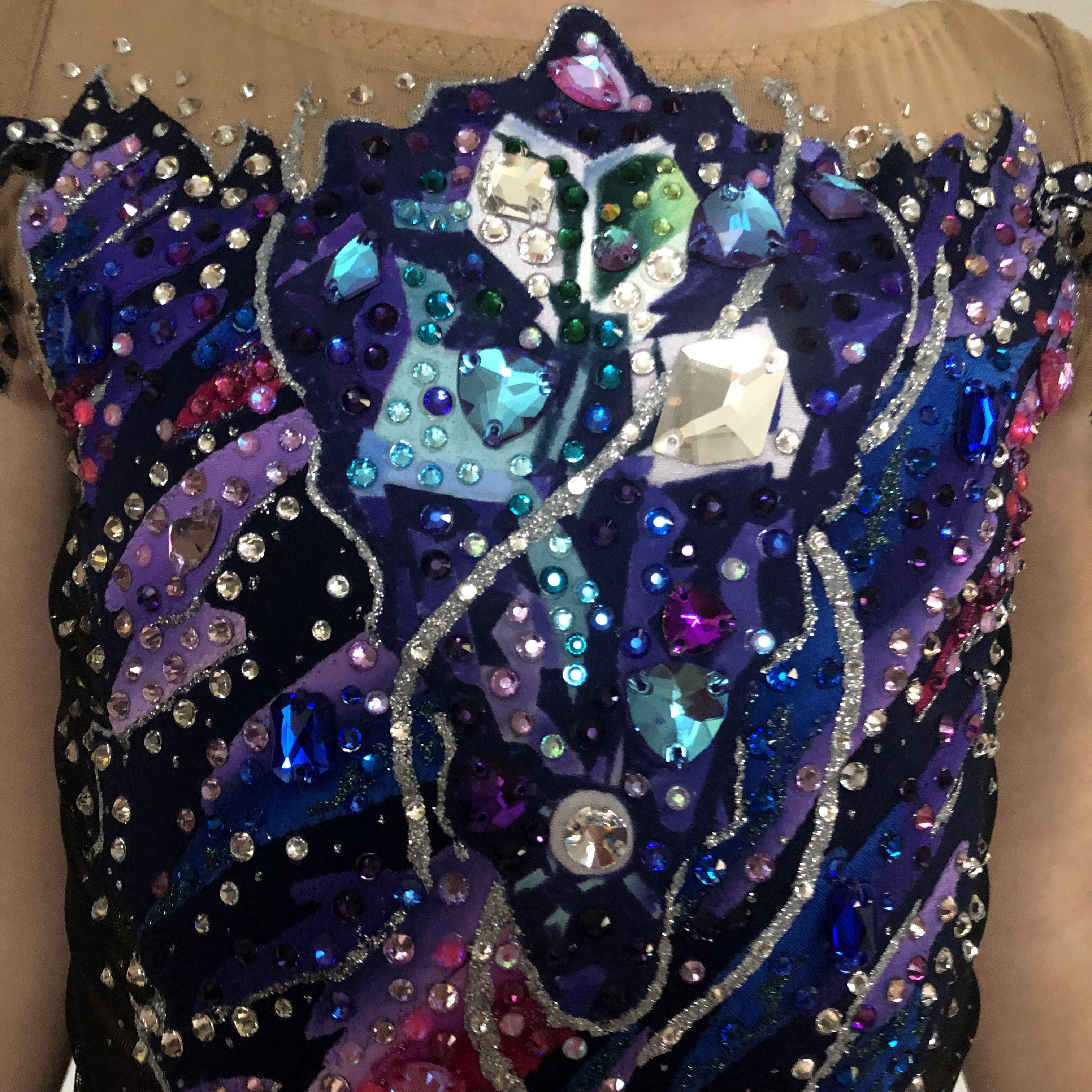 Идея сложилась только спустя 1,5 месяца. Я приняла не стандартное для себя решение, нарисовав большой кристалл на груди купальника. Он, как сияющая звезда, окруженный космическим блеском, сиянием вселенной - этим многообразием красок.
