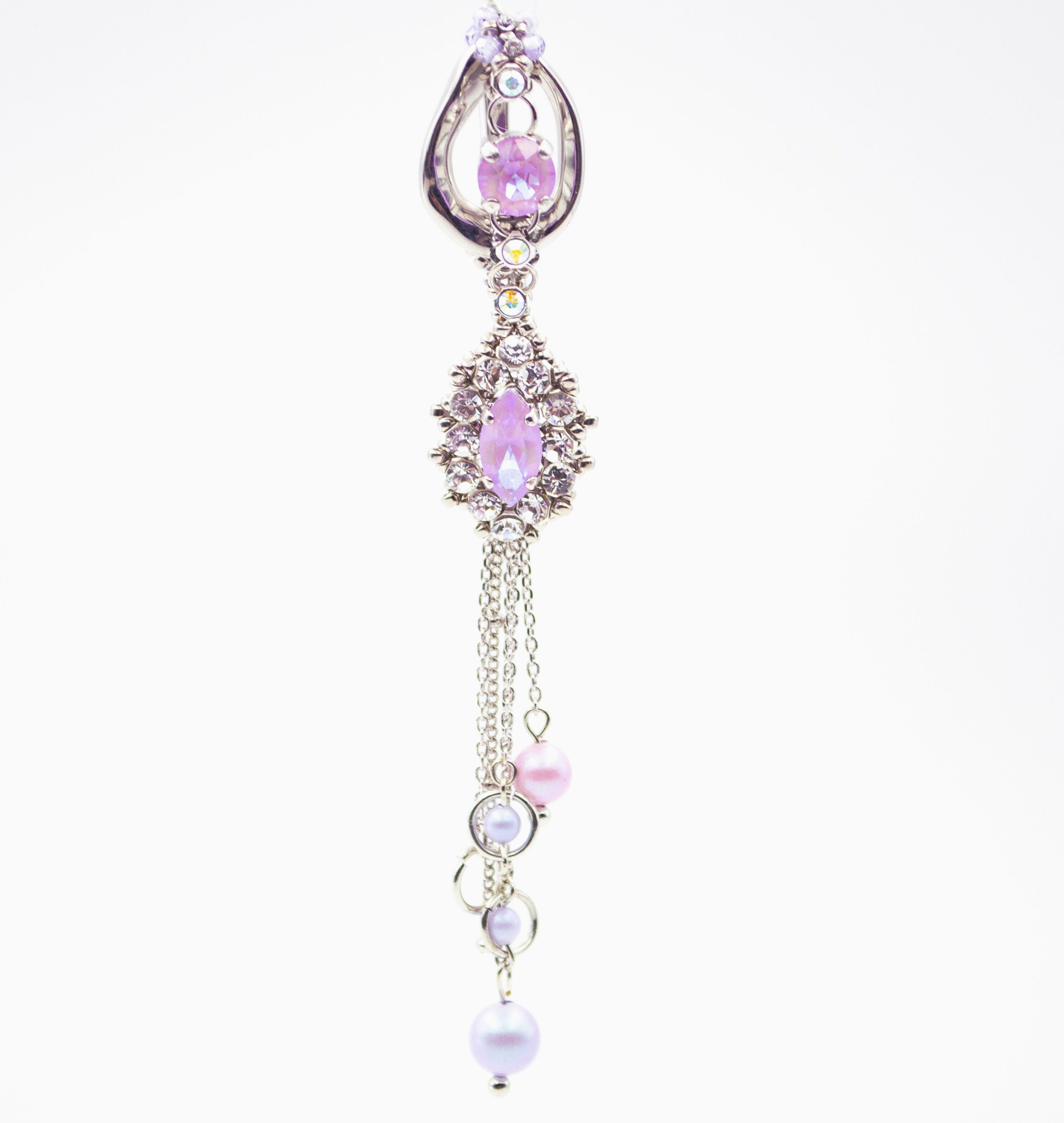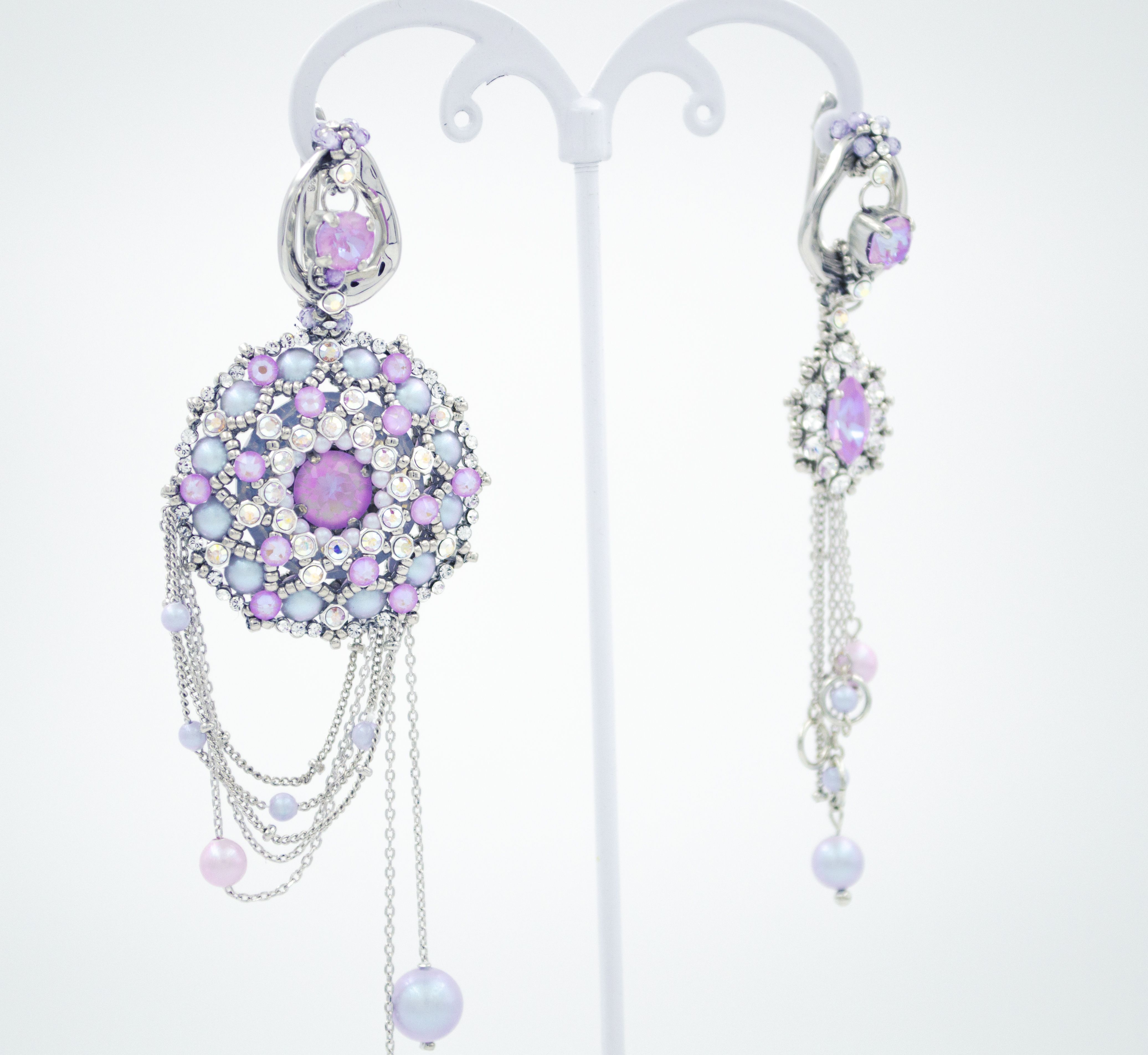 Серьги выполнены с использованием техник плетения и инкрустации мельчайшими кристаллами.