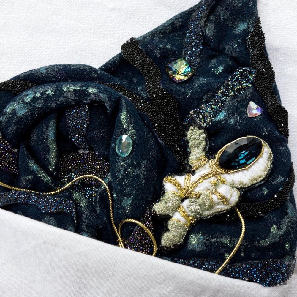 Одна из сторон личности моего супруга – это любовь к жанру научной фантастики, и именно поэтому платочек выполнен в виде маленького кусочка большого космоса, в центре которого – отважный исследователь, готовый к покорению