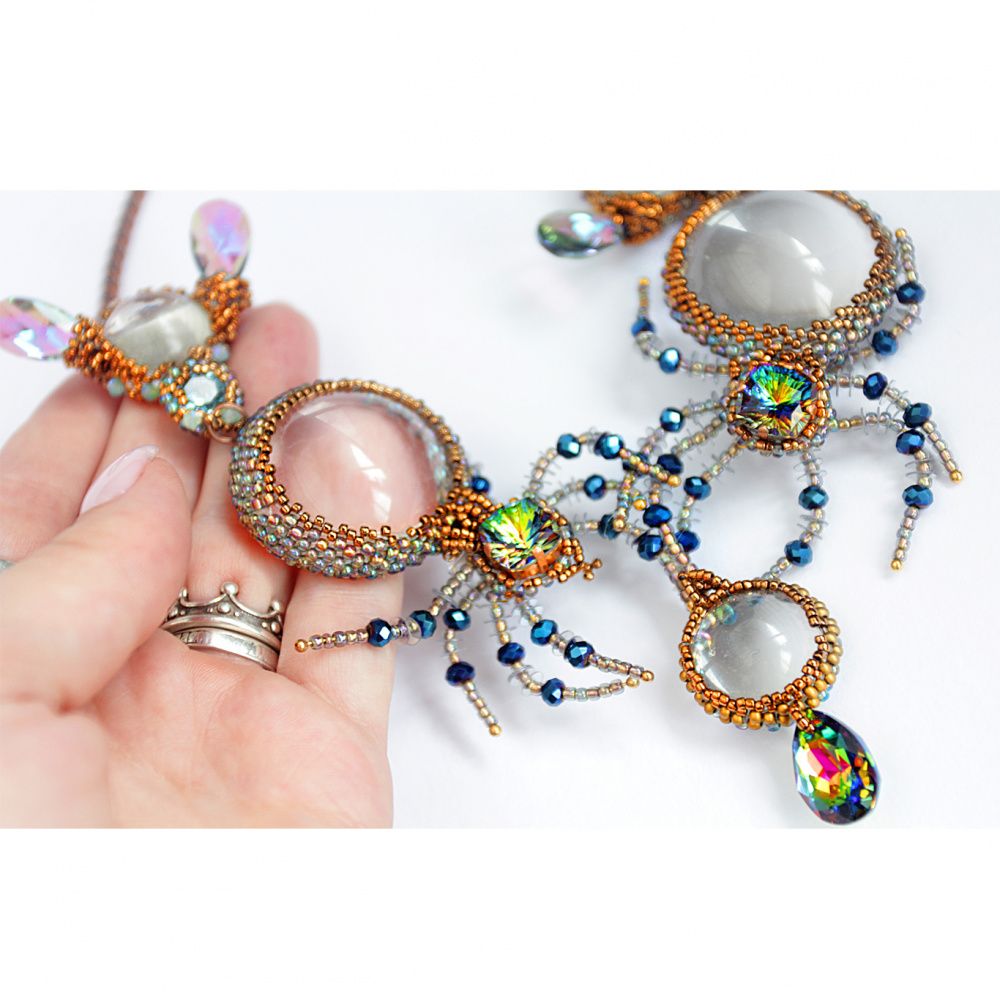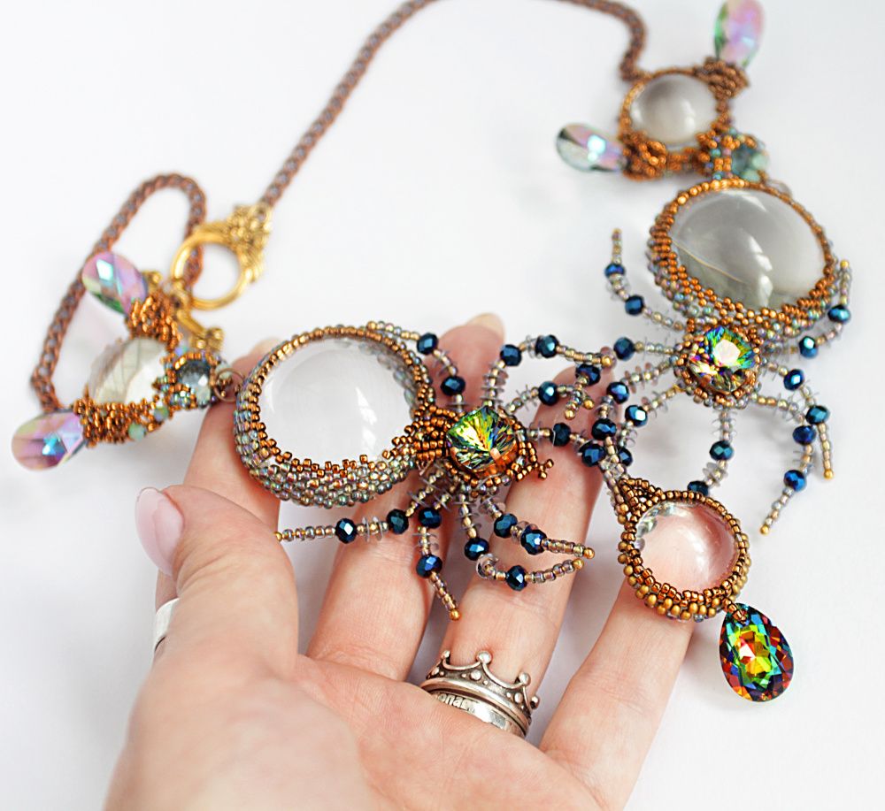 Очень хотелось показать,что обычный стеклянный кабошон тоже может сиять. Мои прозрачные, как будто созданные из воды пауки охотятся на таких же невесомых мух. Так я вижу новые грани сияния.