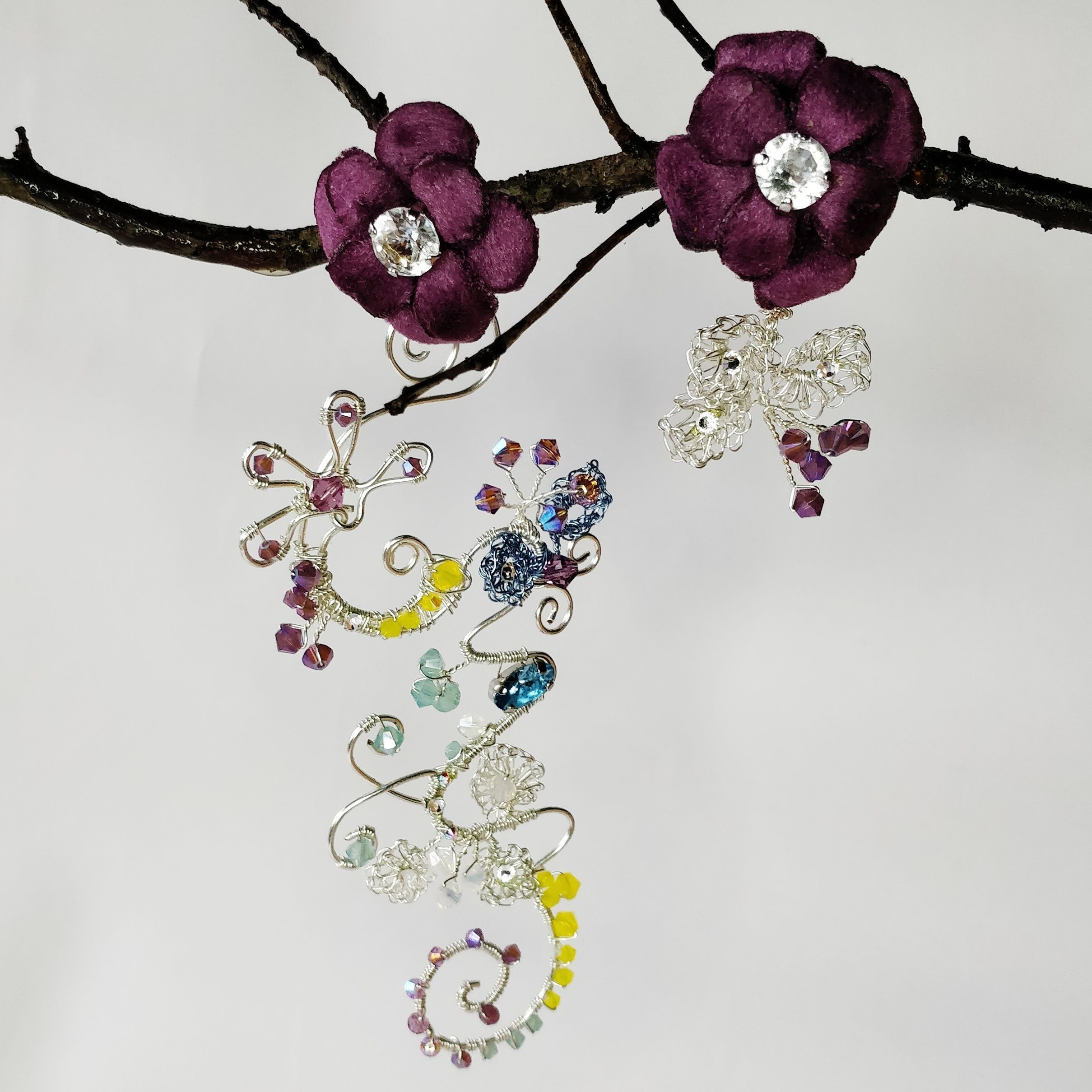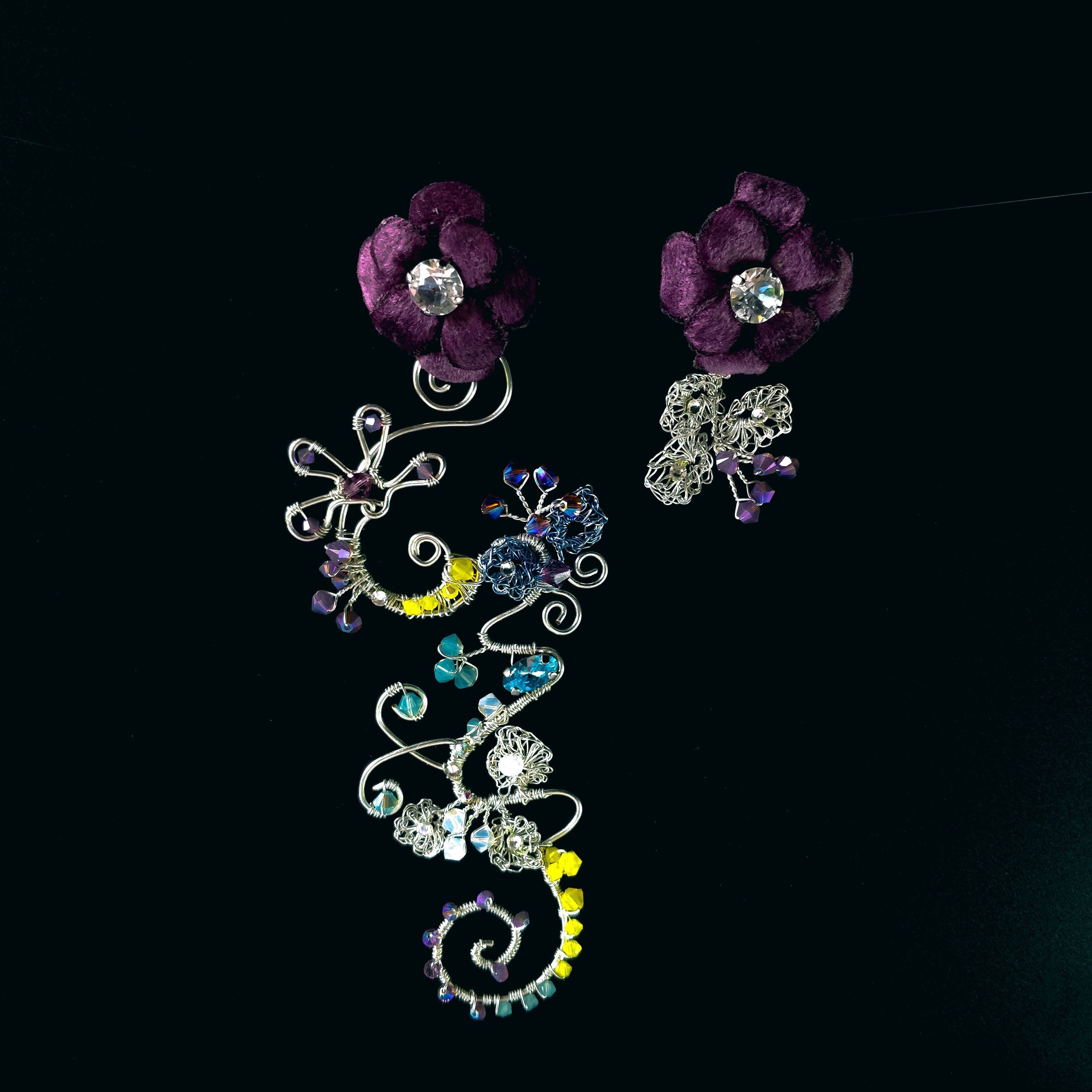 Август - это месяц смены времён года. Он разнообразен и эмоционален. Поэтому серьги "Сияние Августа" многогранны. Они богата смешением красок: от белого до темного аметистового, фактур: от нежного и теплого бархата до холодного металла, техник выполнения: плетение wire wrap, вязание.