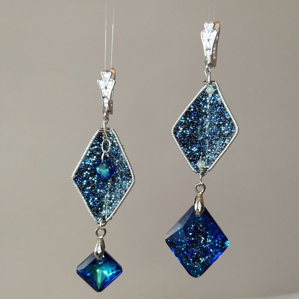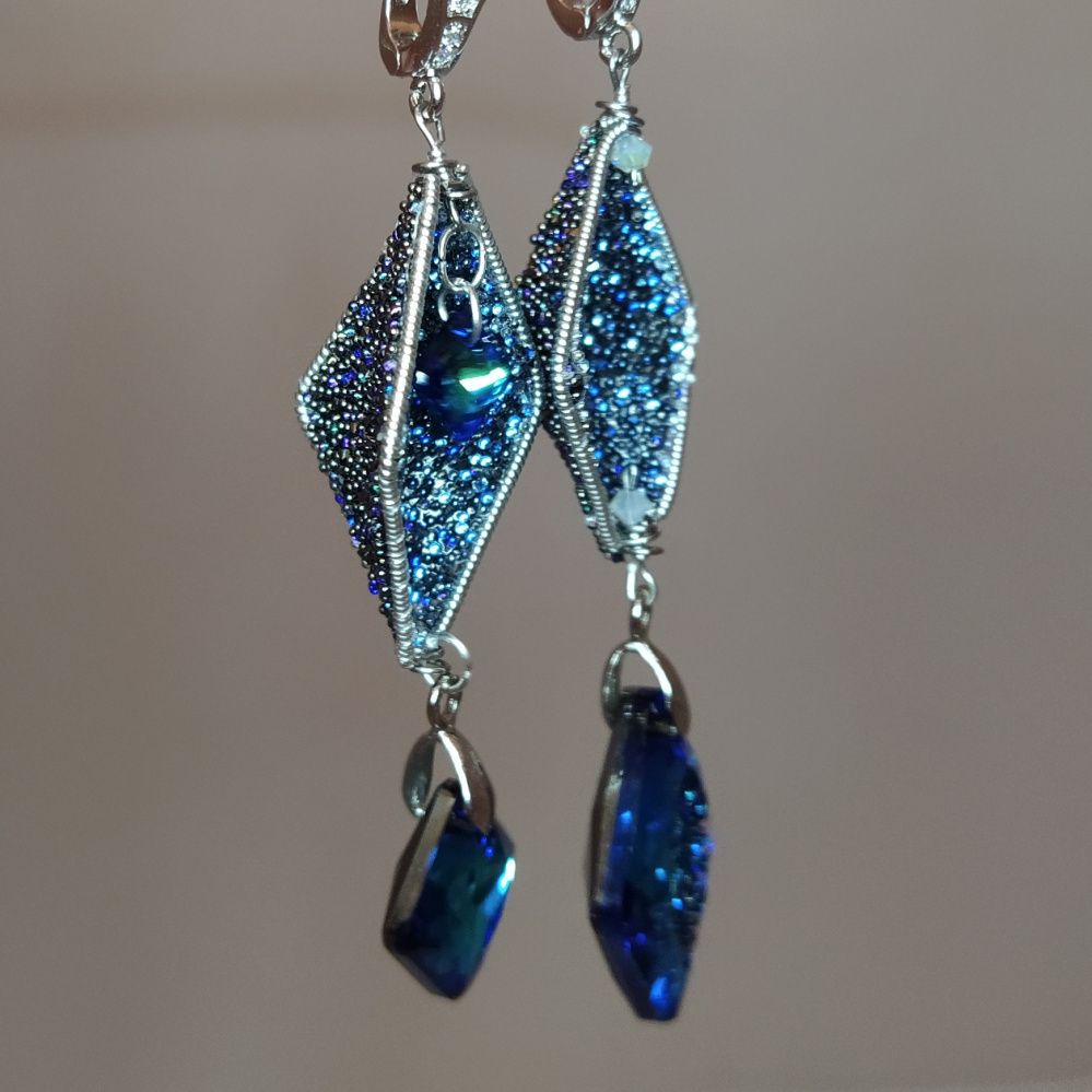 Серьги полны неожиданностей - новых граней. Это и две кристальные ткани - Transparent Crystal Moonlight и Black Crystal Moonlight, которые благодаря прозрачной основе первой дополнили друг друга и дали совершенно новый и неожиданный эффект. И ассиметрия, и разные подвески - всё продолжает и поддерживает тему неожиданных новых граней, которыми все время удивляет нас жизнь.