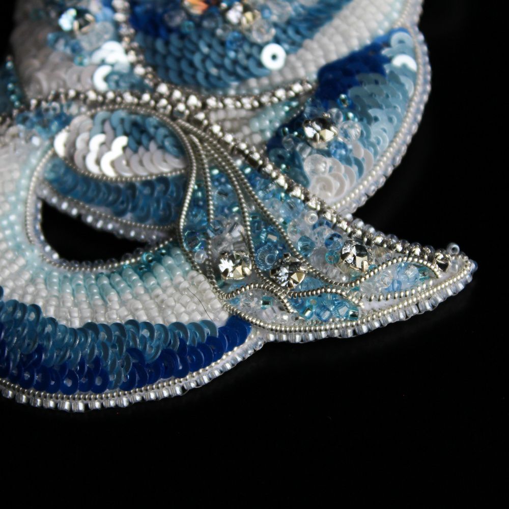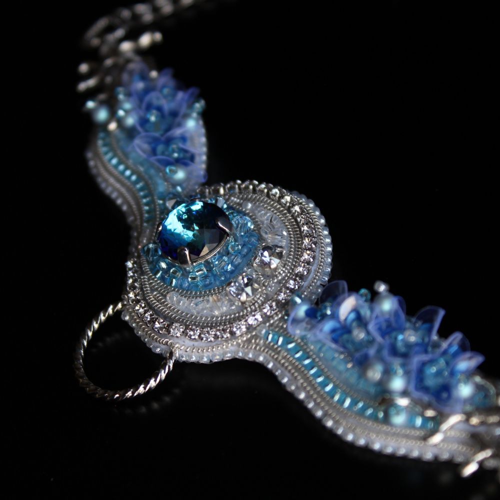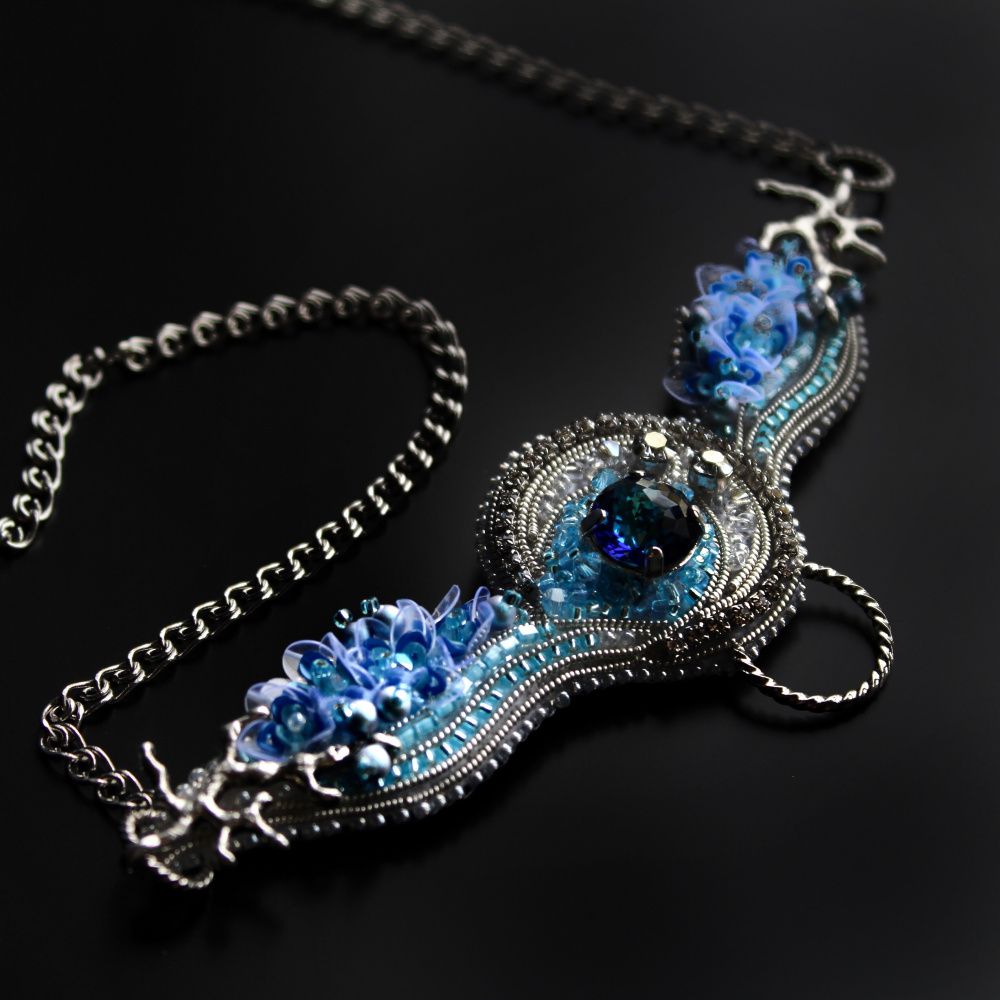 Выбранный цвет изделия не случаен. Что рисует Ваше воображение, когда вы думаете о владыке водной стихии? Возможно вы увидите кристально чистую горную речку или водопад, мерцающий под солнечными лучами? Может быть это тихая и сияющая гладь озера или бескрайний голубой океан? В своей работе я попыталась собрать воедино все эти оттенки.