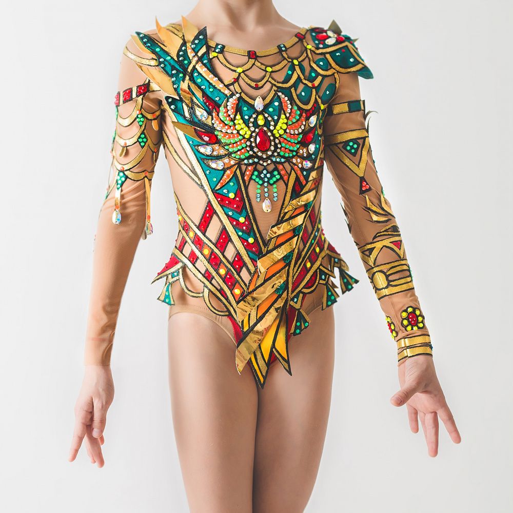 Так же в изготовлении данного изделия применялись такие современные материалы, как золотой винил и глитерная ткань. Именно такие плотные и сверкающие материалы придают костюму необходимый объём и сияние. И в заключении, к купальнику добавились удивительной красоты кристаллы, которые придают особенную эффектность и делают данный образ цельным и завершенным.