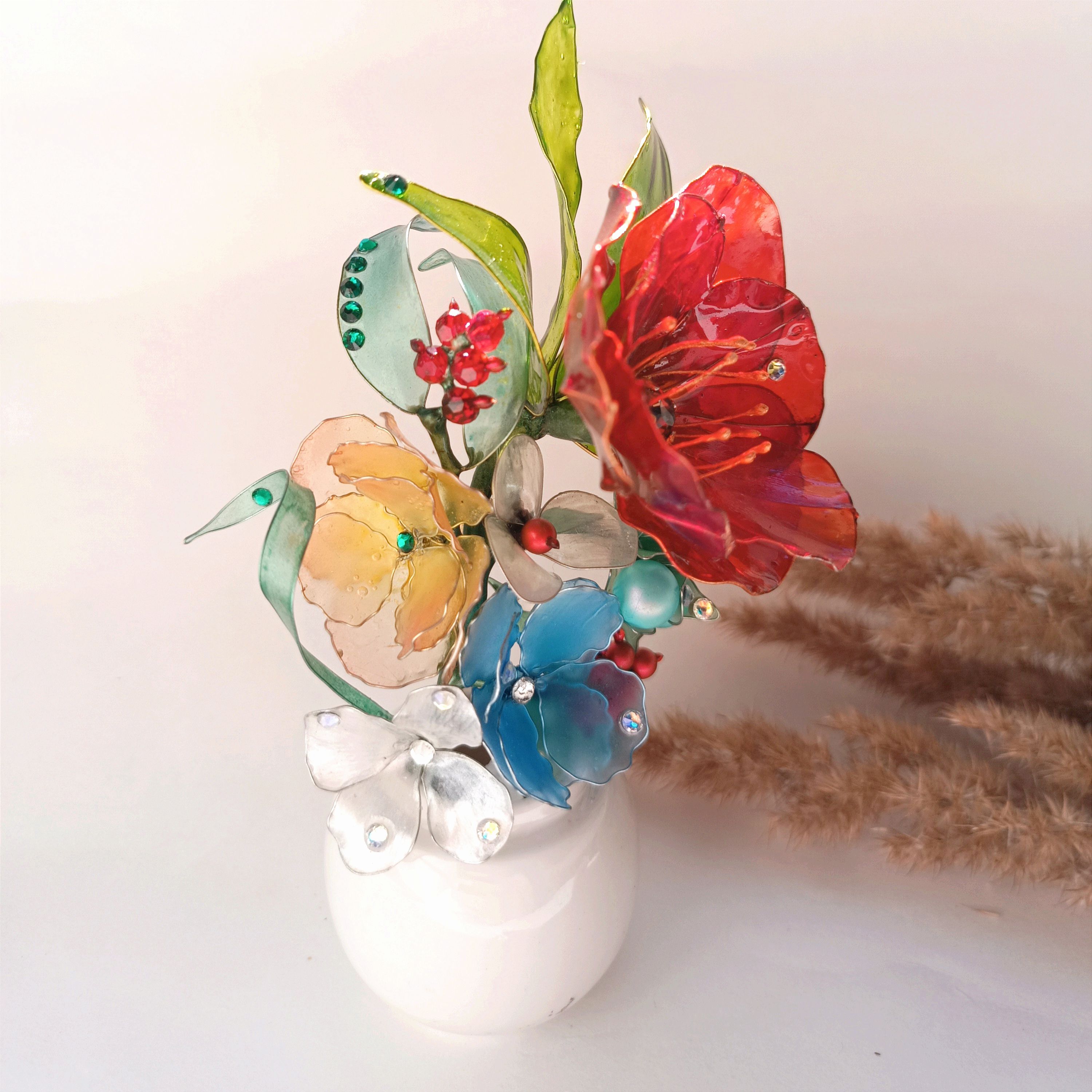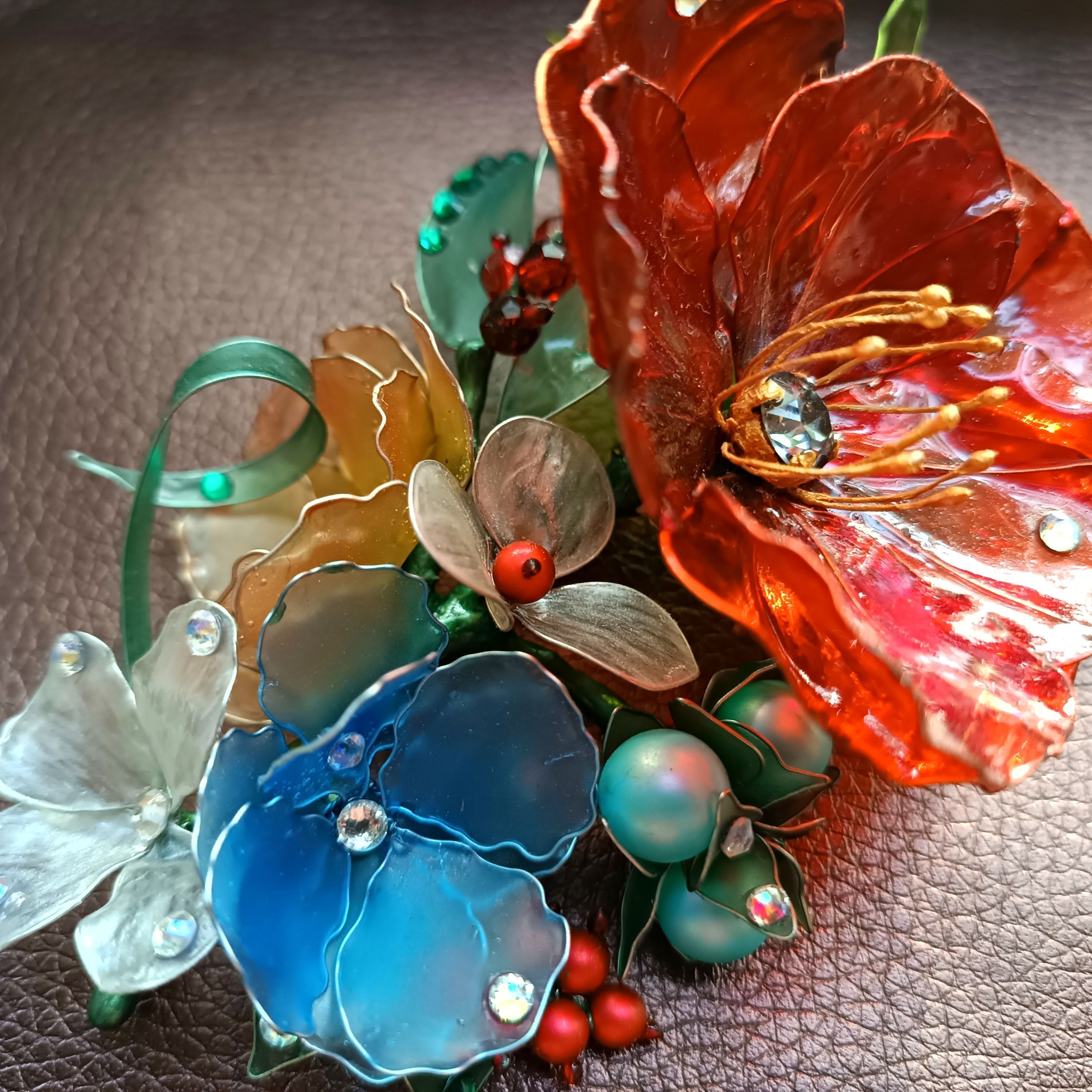Данная работа представляет собой брошь в виде полевого букета, олицетворением которой является скромность, простота, лёгкость. Частичка лета запечатленная в каплях утренней росы на листьях как символ чистоты и невинности.