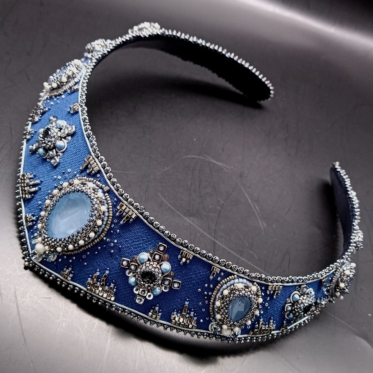 В диадеме «Красавица мегаполиса» объединились: джинсовая ткань, сохраняющая свои позиции в современной моде, кристаллы и жемчуг Swarovski, которые с успехом заменили натуральные жемчуг и драгоценные камни. Кристаллы цвета Sky Ignite и Silver Night красиво мерцают на фоне синего денима.