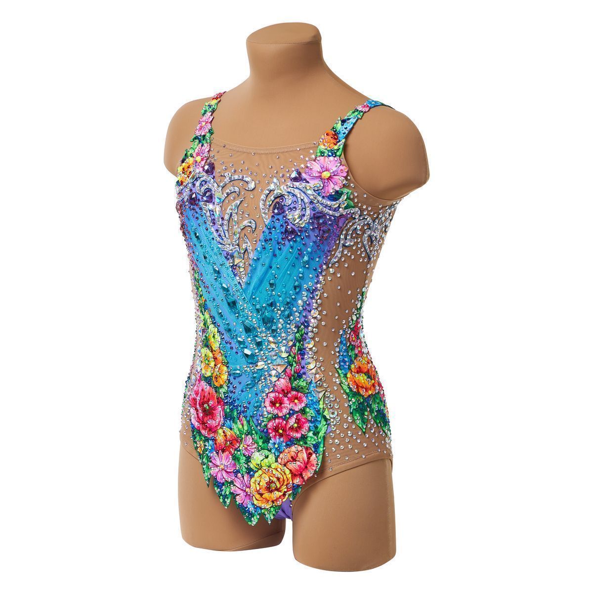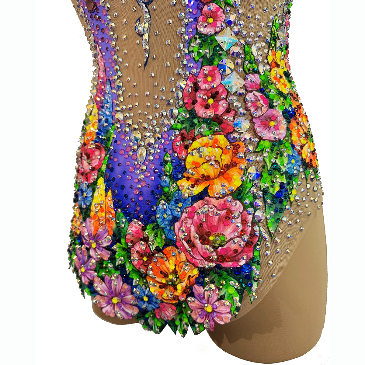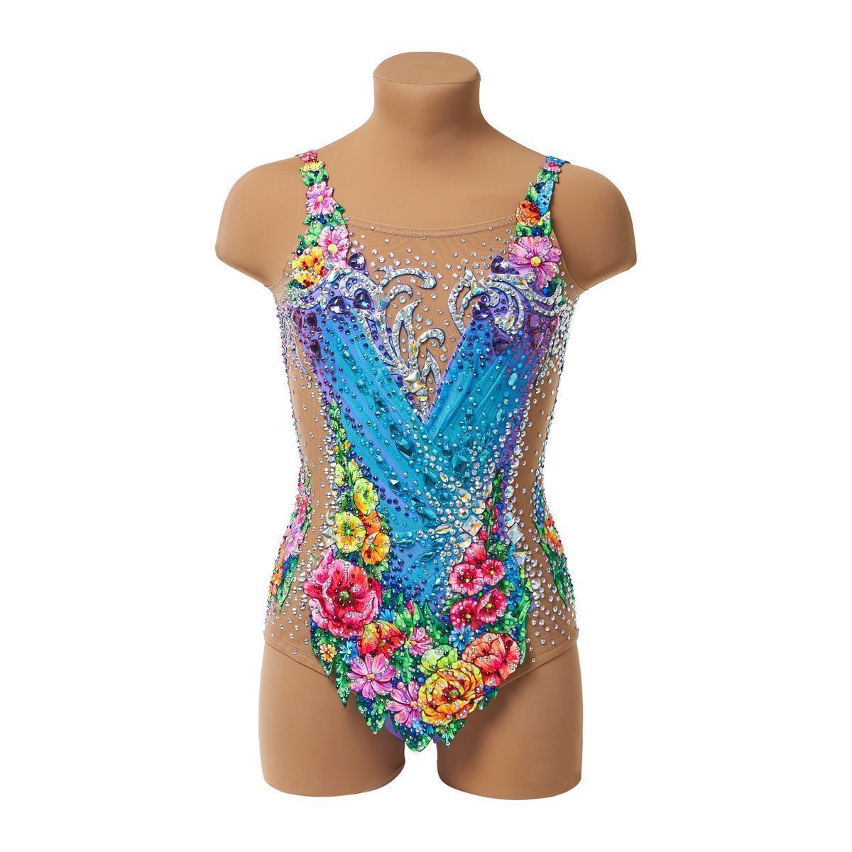 «Вальс цветов» — это купальник о гармонии и красоте. Голубая основа с нежными фиолетовыми переливами создаёт ощущение лёгкости, словно прозрачные волны музыки, а яркие цветы, усыпанные множеством сияющих страз, превращают костюм в живой танец красок. Каждый элемент рисунка дышит изяществом, передавая настроение праздника и величия.