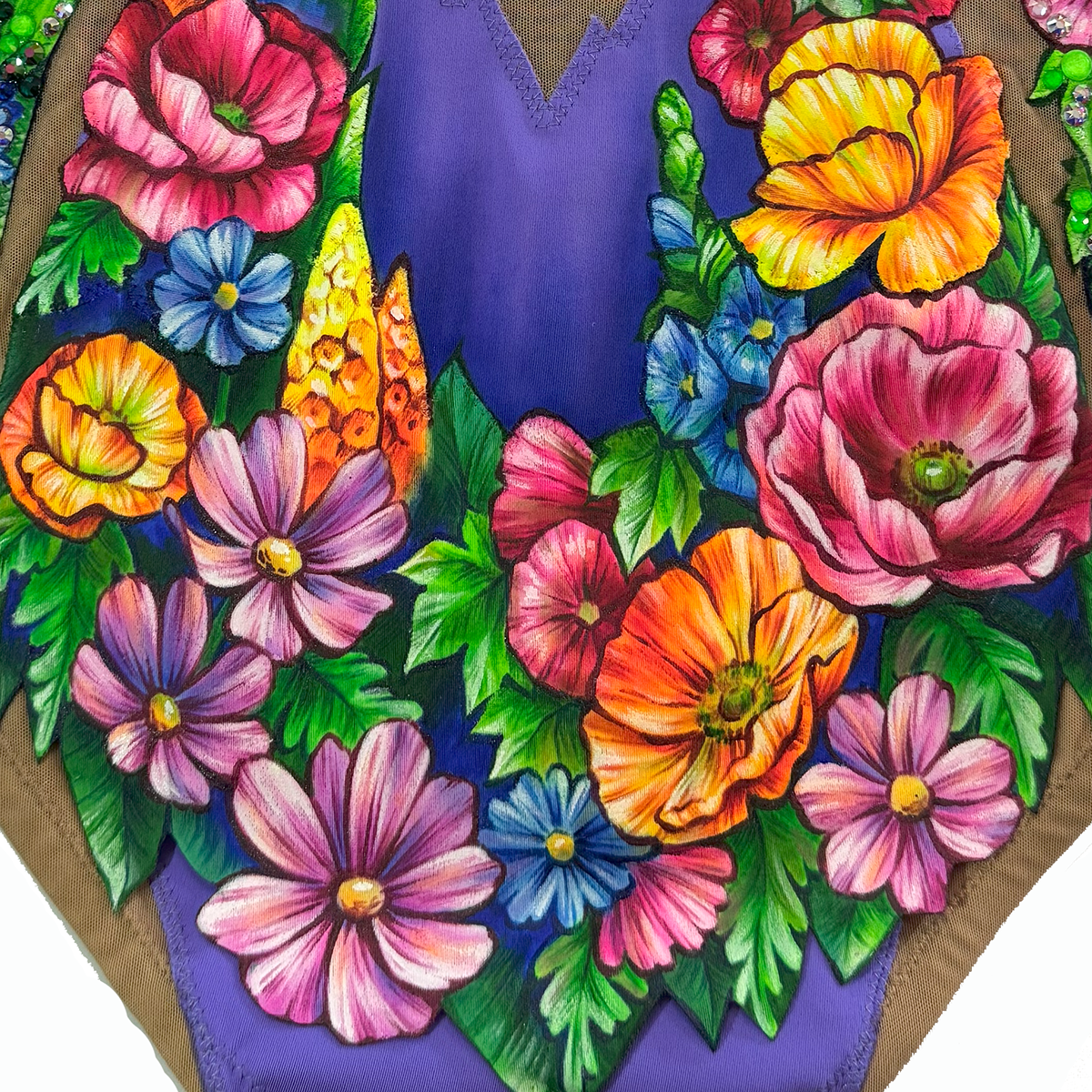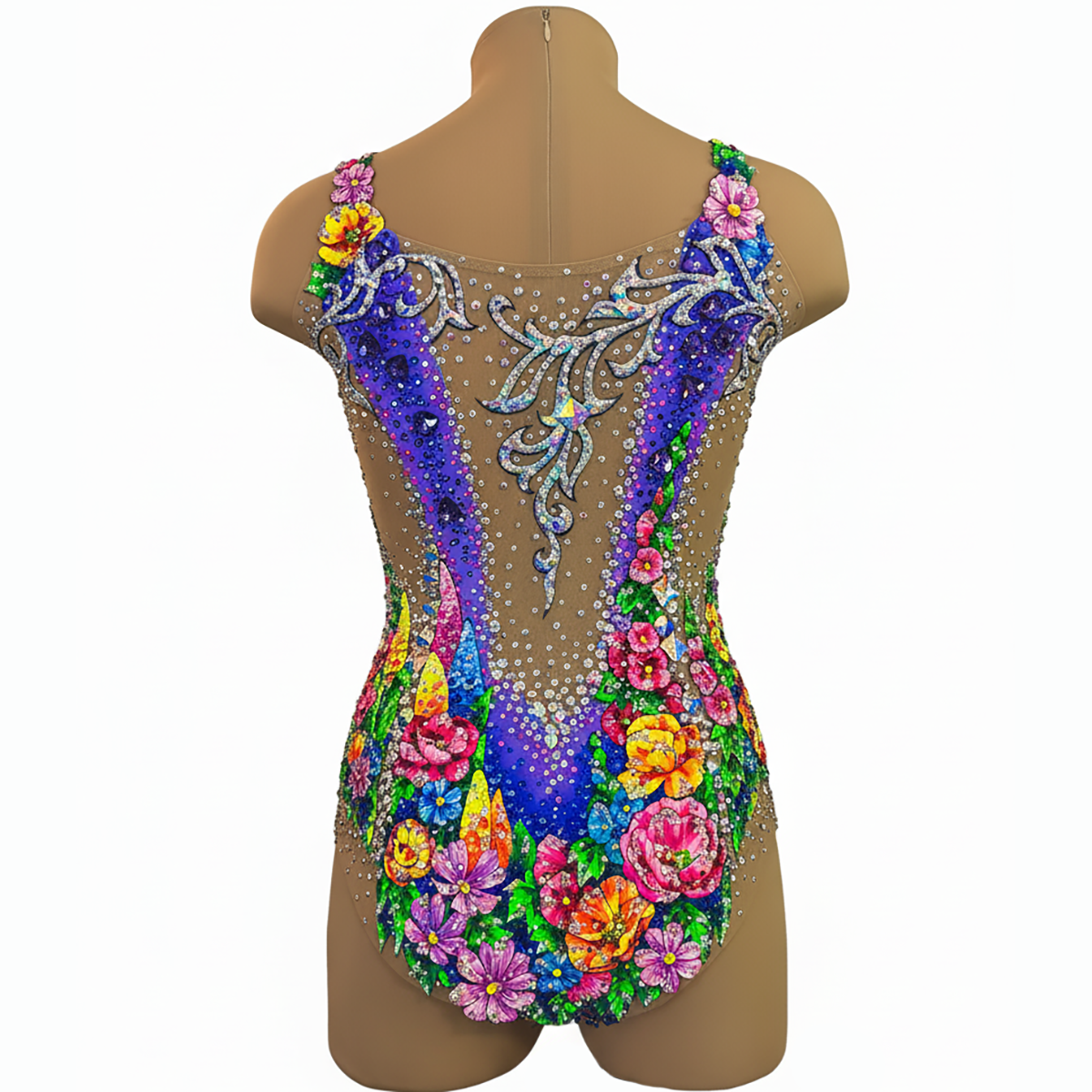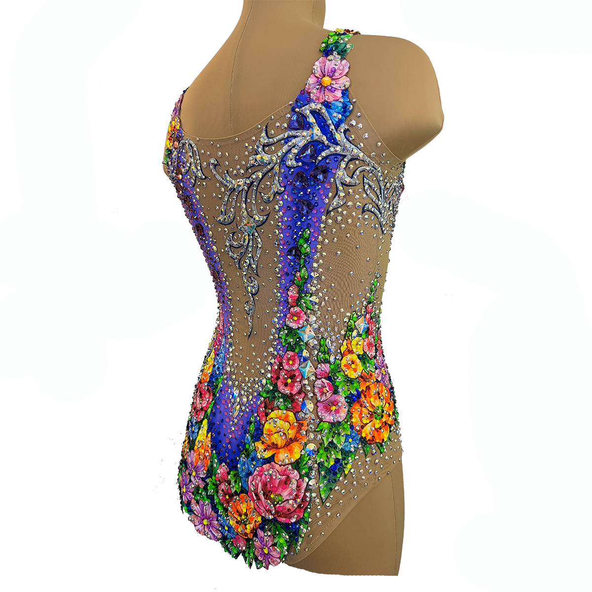 «Вальс цветов» — это купальник о гармонии и красоте. Голубая основа с нежными фиолетовыми переливами создаёт ощущение лёгкости, словно прозрачные волны музыки, а яркие цветы, усыпанные множеством сияющих страз, превращают костюм в живой танец красок. Каждый элемент рисунка дышит изяществом, передавая настроение праздника и величия.