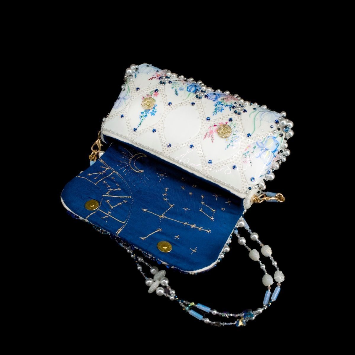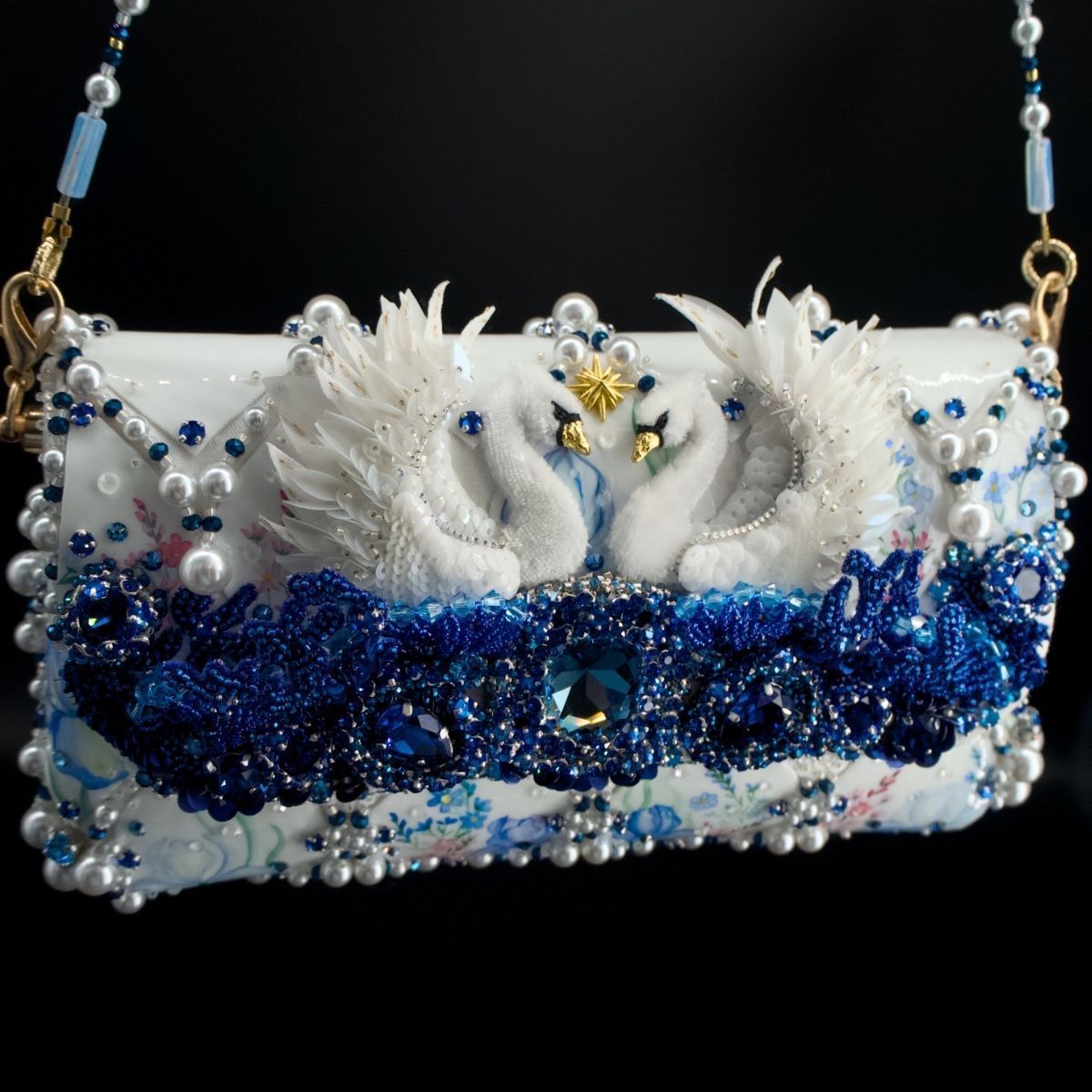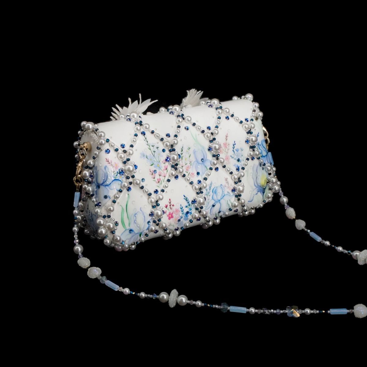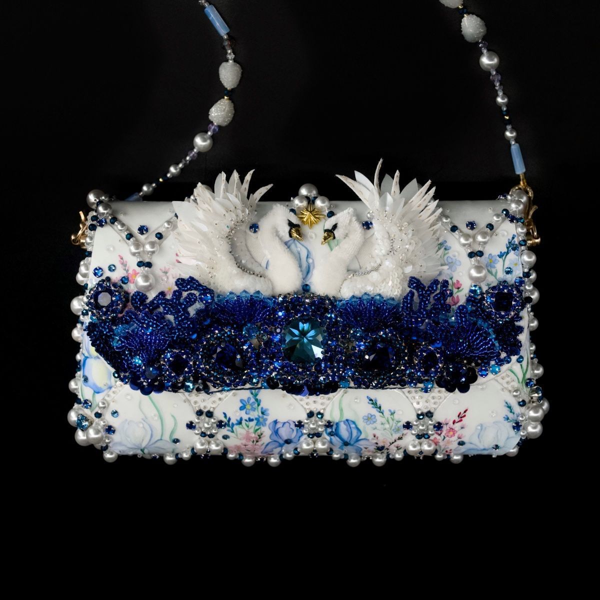 В представленной сумочке этот сюжет обрел свой символичный, счастливый финал, найдя свое отражение в мерцании хрусталя и жемчуга, в бликах расписного «фарфора», как напоминание о хрупкости, казалось бы, незыблемых идеалов и традиций.